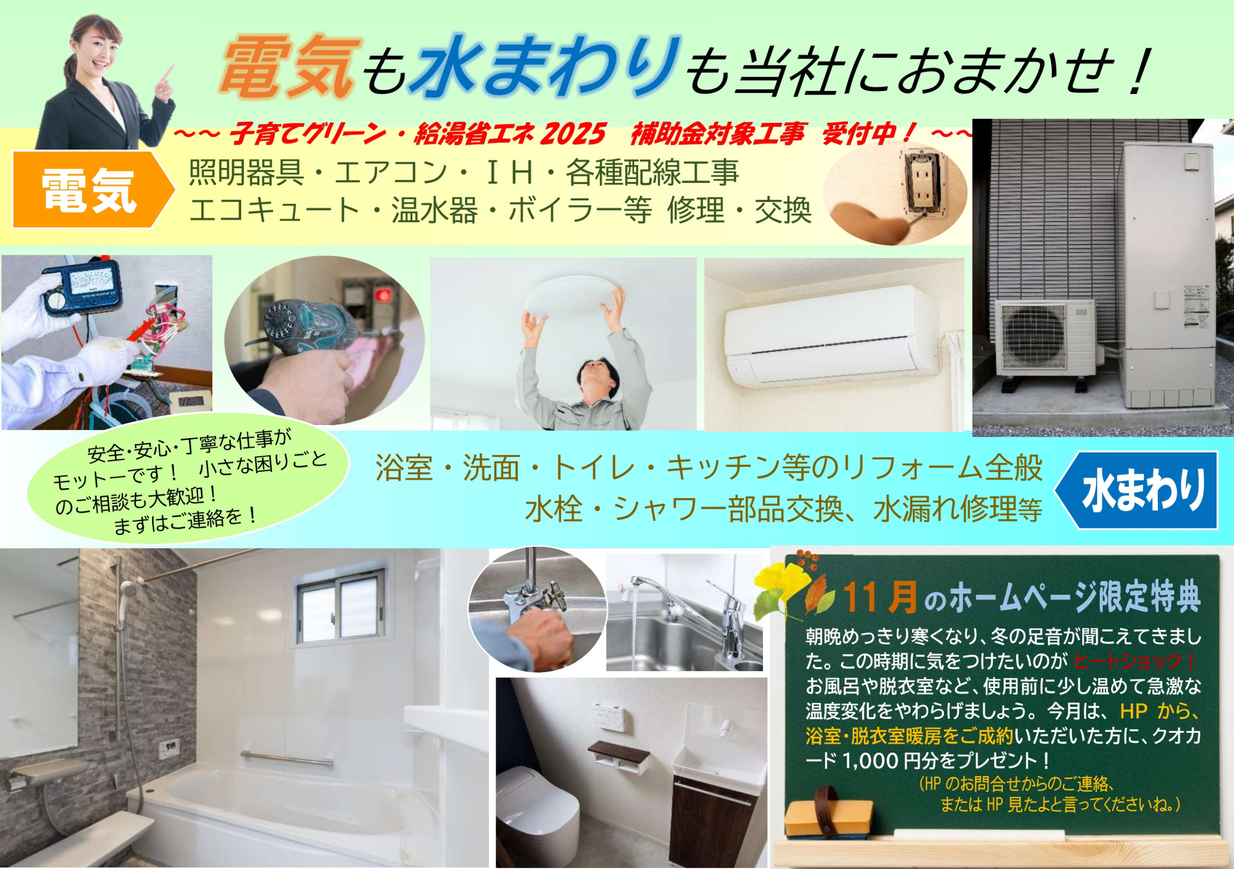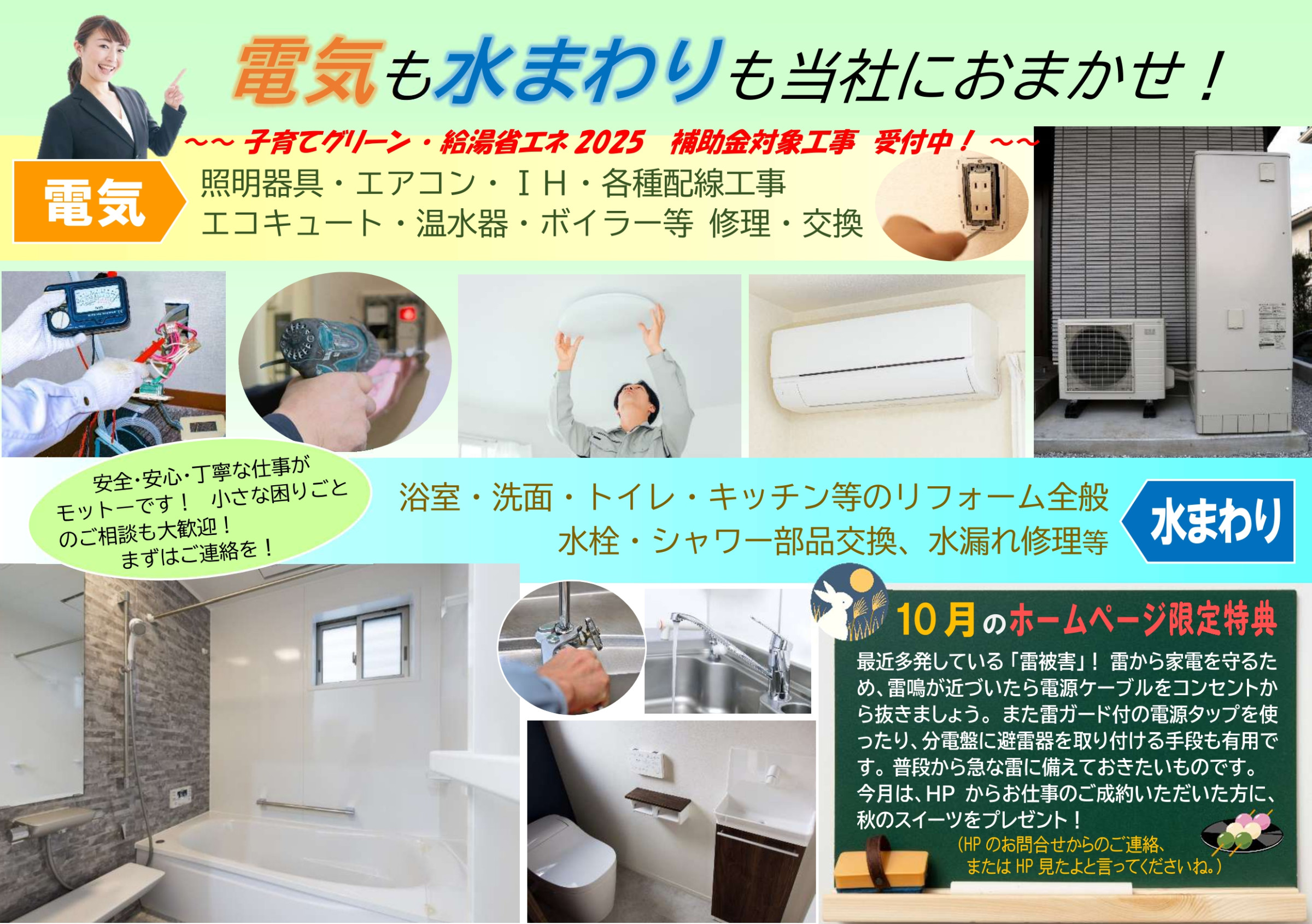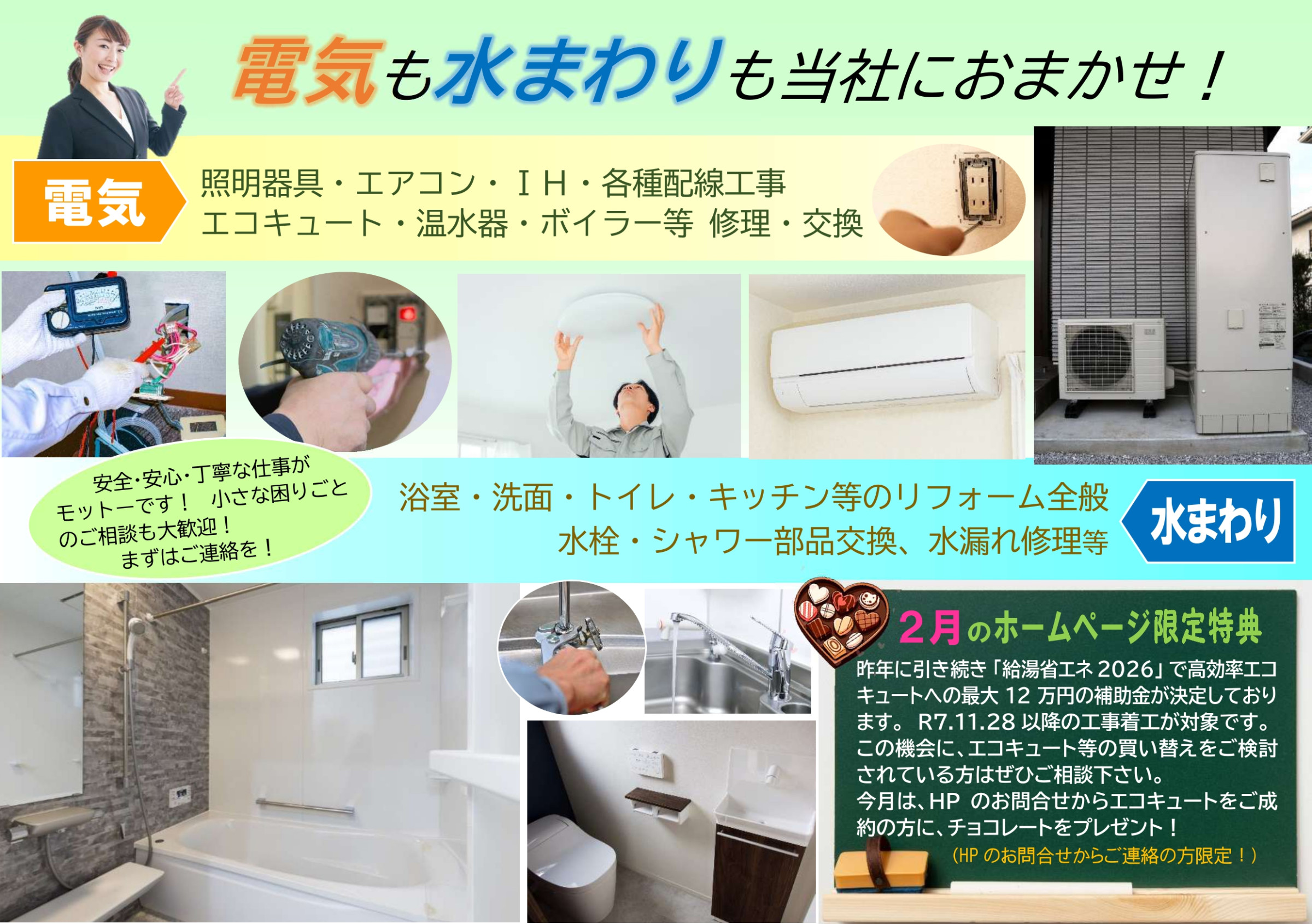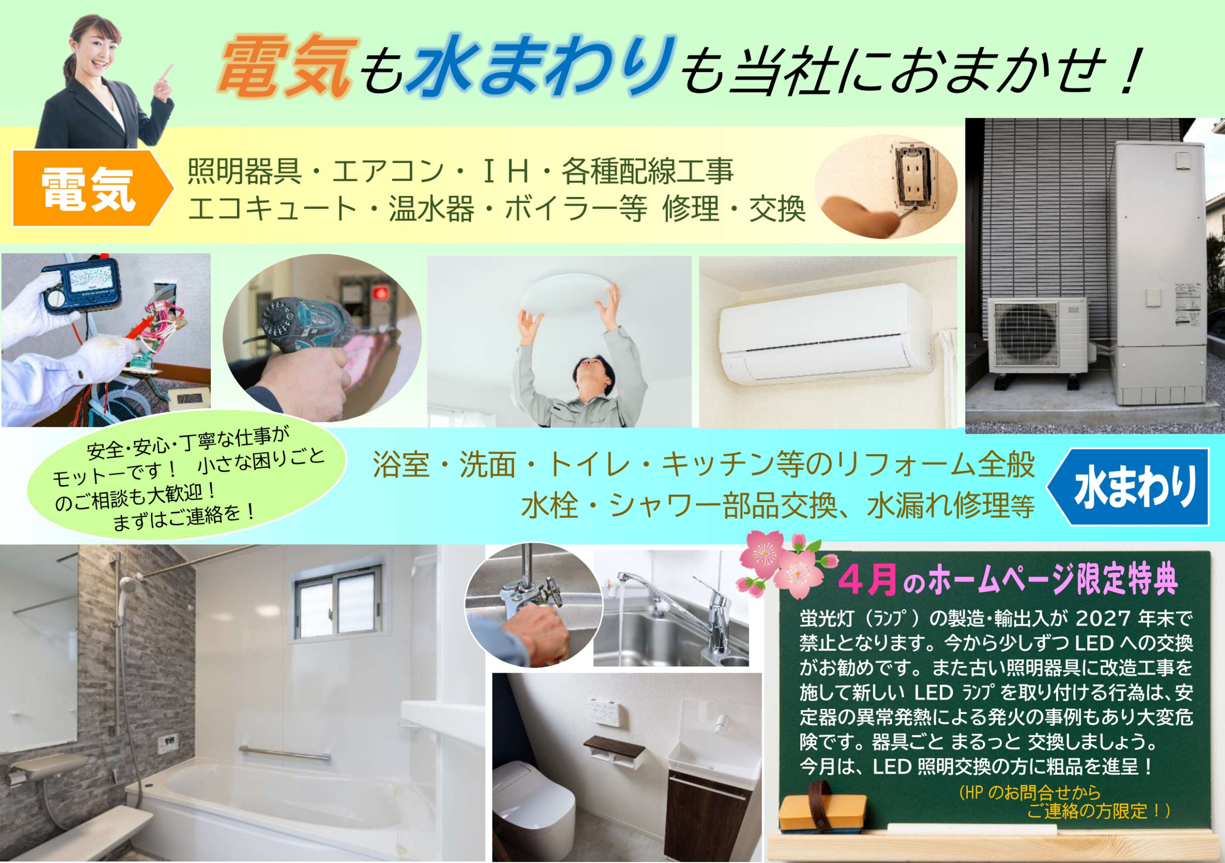 スイッチ・コンセント・照明の取り付けをはじめ、エアコン、エコキュート等電気工事全般、キッチン・トイレ・お風呂等水まわりのトラブルからリフォームまで、当社は、電気と水まわりに関して幅広く地域の皆様のご要望にお応えいたします。